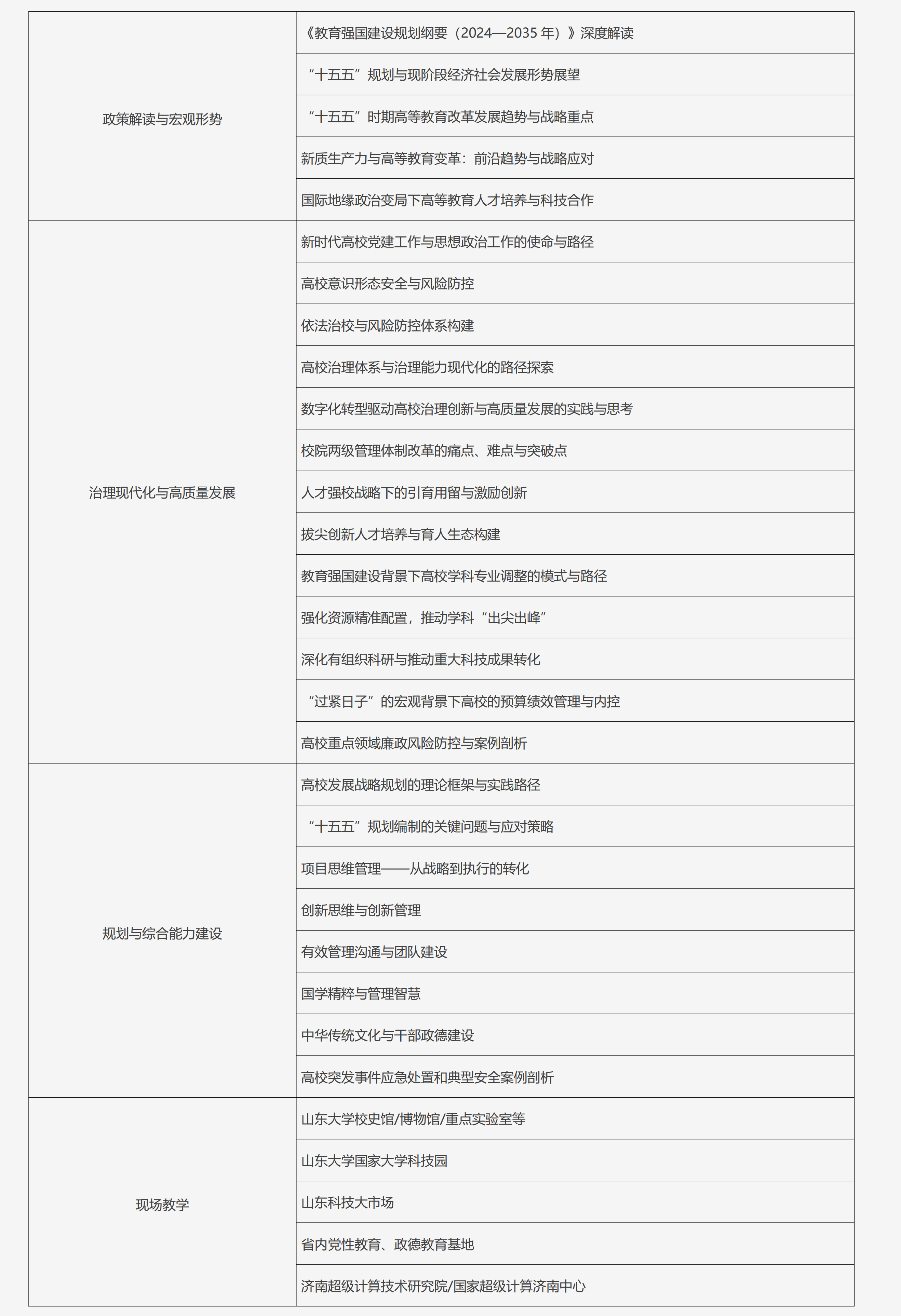 2026年是“十五五”开局之年,也是《教育强国建设规划纲要(2024—2035年)》纵深推进、三年行动计划承上启下的关键之年。规划纲要明确提出,要增强高等教育综合实力,打造战略引领力量,分类推进高校改革,引导不同类型高校科学定位、特色发展。当前,各高校正处于“十四五”收官与“十五五”开局的交汇期,如何在服务教育强国战略大局中找准定位、提升战略领导力,如何通过现代化治理将战略蓝图转化为高质量发展的生动实践,已成为高校领导干部面临的重大课题。战略领导力是高校在复杂变局中把握方向、凝聚共识、推动变革的核心能力,现代化治理则是将战略意志转化为组织效能的制度保障。基于此,山东大学继续教育学院依托学校深厚的学术积淀与丰富的干部培训经验,精心策划本专题。专题旨在助力高校中层及以上领导干部提升战略前瞻能力、规划编制能力与治理创新能力,为高等教育强国建设贡献山大智慧。