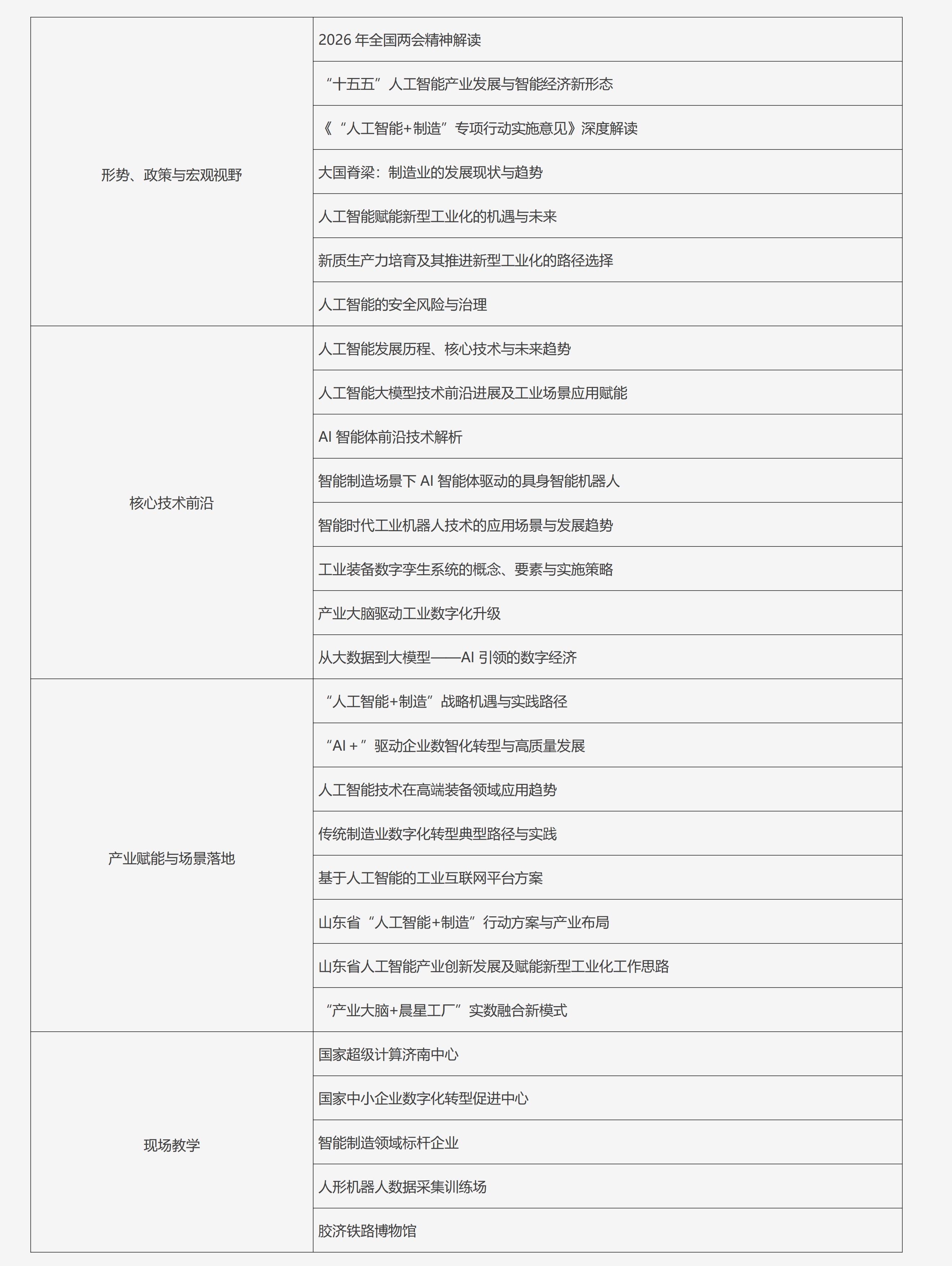 专题充分结合山东省的发展态势与独特优势。山东是全国工业门类最齐全的省份,正加速从“制造大省”向“智造强省”跨越。其中,济南作为国家数据要素综合试验区、国家人工智能创新应用先导区、新一代人工智能创新发展试验区、国家工业互联网示范区“四区叠加”城市,拥有雄厚的产业基础,正全力打造“人工智能+制造”融合发展新高地。青岛则跻身全国首批“国家新型工业化示范区”,具备突出的行业资源优势。课程设计坚持高站位、实战化导向,旨在帮助干部精准把握技术前沿、明确实践路径,切实将“人工智能+”的战略势能转化为推动新型工业化走深走实的强劲动能。
